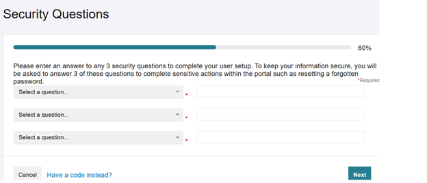 You will be prompted to choose security questions and populate responses to each question. These are required to continue the registration process.